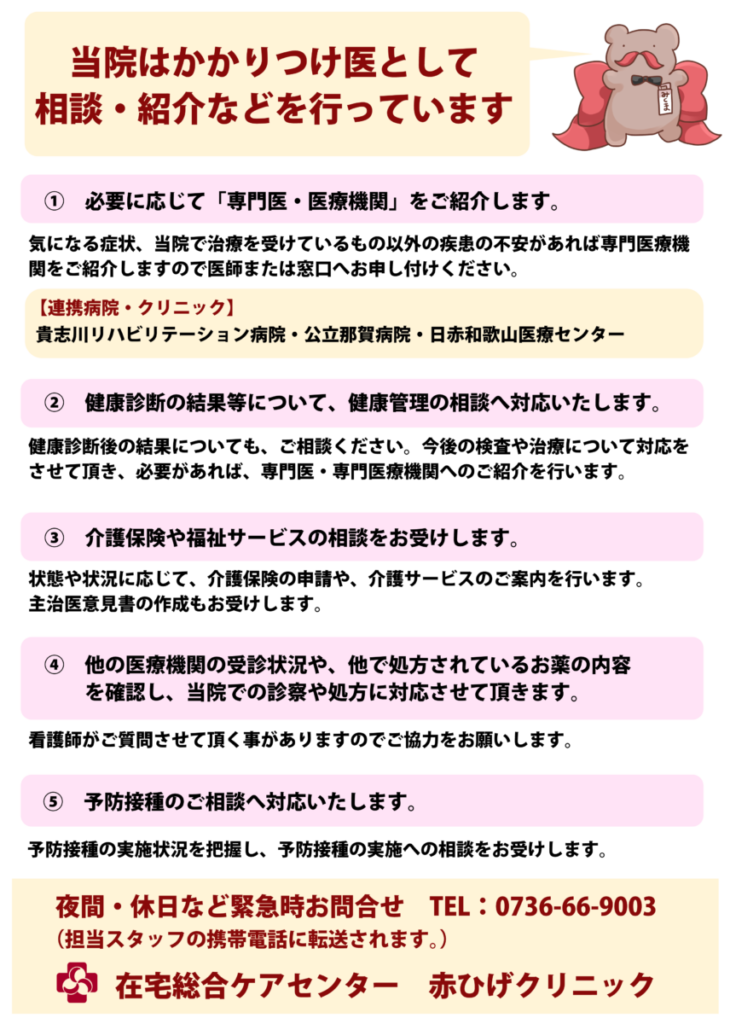またケアプランセンターもありますので介護保険の申請やベッド福祉用具のレンタル、ディケア・ショートステイ・施設入所など様々な介護サービスのご利用時にもご相談ください。 訪問診療では年中無休365日24時間体制で急変時の対応をしておりますのでご安心ください。 入院が必要な場合は当院の関連病院として貴志川リハビリテーション病院、公立那賀病院、日赤和歌山医療センター、和歌山県立医大などの高次病院とも提携しております。