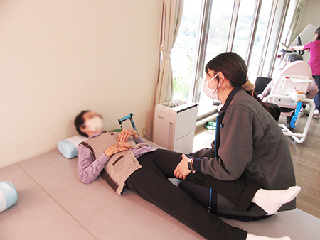 寝返りにくくなった、ベッドから起き上がれなくなった方に対して、動作練習を行い利用者自身でこれらができるように、また介護者負担を軽減できるように行っていきます。