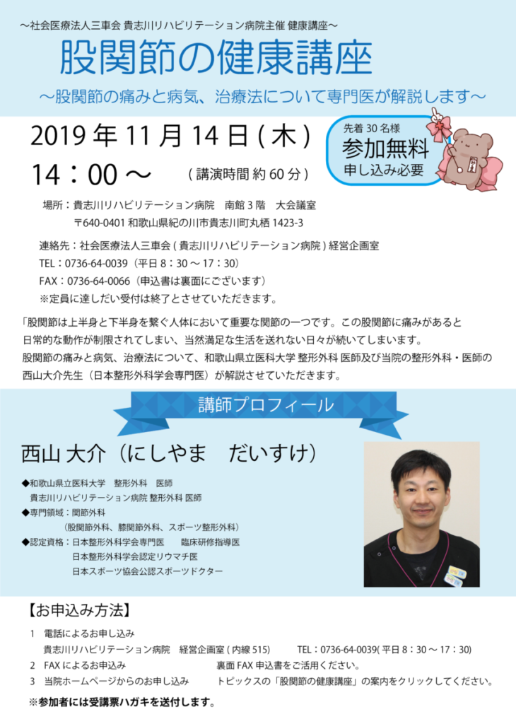 11月14日 西山 大介医師による【股関節の健康講座】を行います