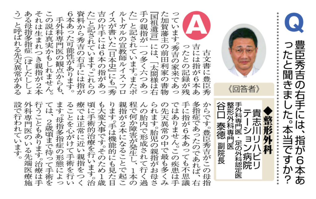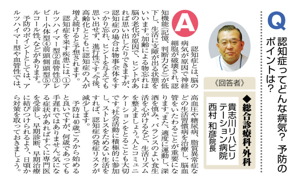 ニュース和歌山掲載について(1月号) 2024/01/30 当院院長の西村和彦医師と当院副院長の谷口泰德医師が、ニュース和歌山 2024年1月号の「おしえて!マイドクターQ&A」に掲載されました。 →総合診療科についてはこちら 手・足の外科センターについてはこちら